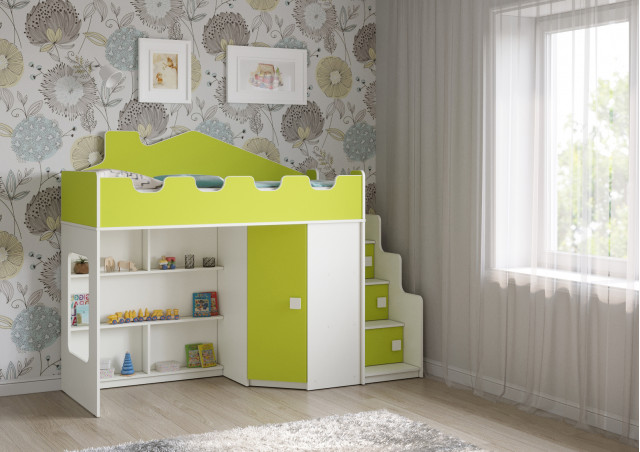 Эта модель кровати станет отличным выбором для вашего малыша. Благодаря угловой лестнице с дверцами и угловому шкафу, ребенок сможет легко и безопасно добраться до своего спального места, а также хранить свои игрушки и вещи в удобном месте.