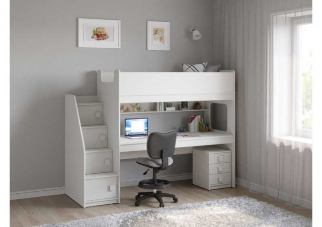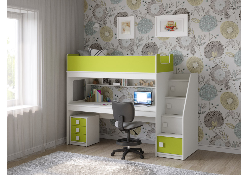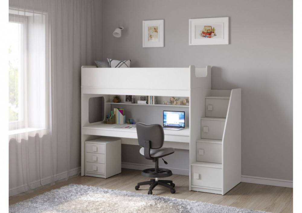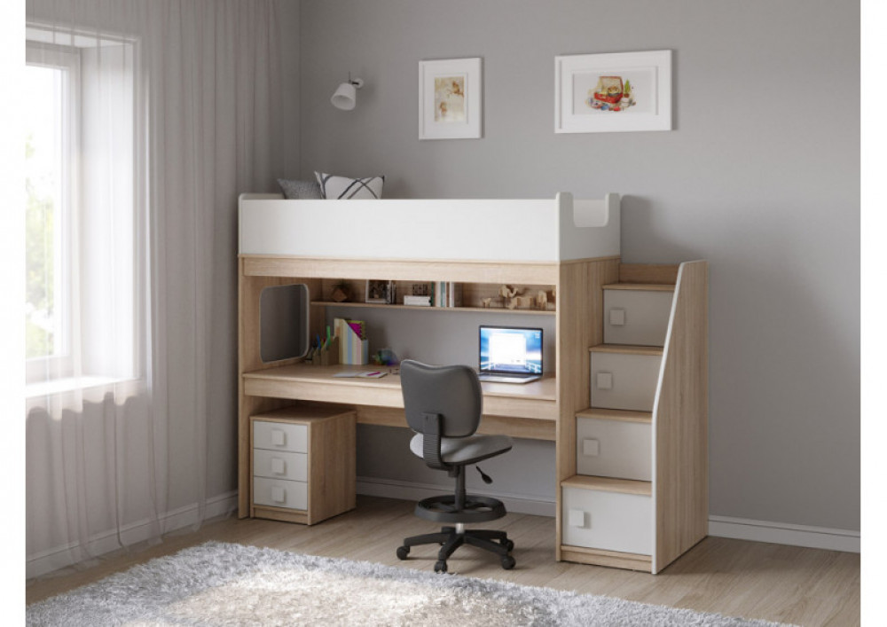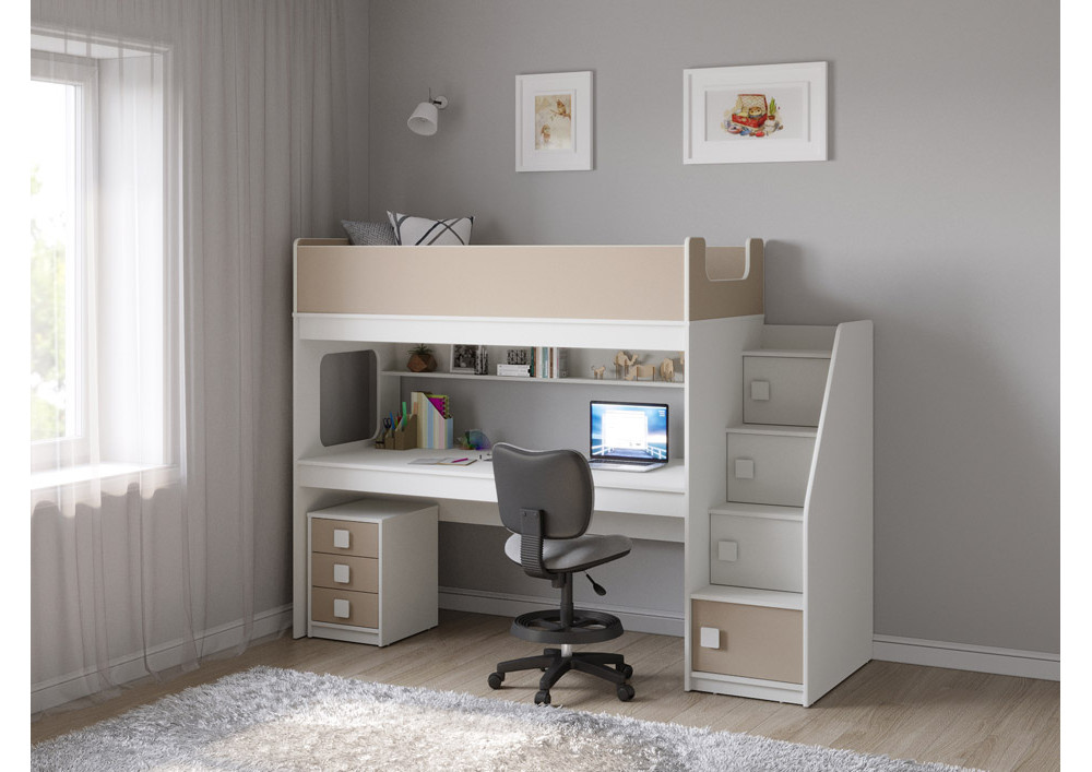 Учебная зона со столом под спальным местом открывает возможности для письменных работ,а также здесь удобно расположить ноутбук, а вместительная тумба поможет в хранеии канцелярских принадлежностей и учебников.